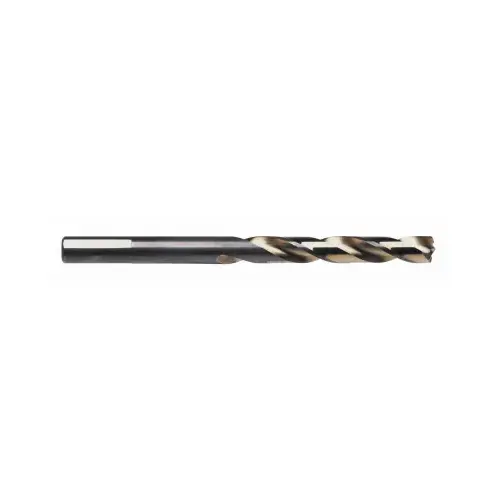 High-speed steel features a black body and gold flute with Turbomax tip for burr-free holes. Exact centering; no walking on straight and curved surfaces. Three flatted shank on 3/16 in and above for better chuck grip. Jobbers length.