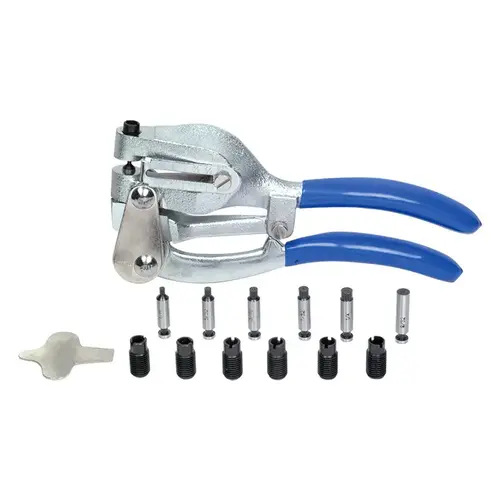 Our powerful CRL J-Channel Punch makes accurate, round holes in metals up to 16 gauge. It is furnished with seven sizes of hardened punches and dies in a molded plastic box. All main parts are drop forged and heat treated. Contoured handles give a comfortable grip. A handy tool for anyone who needs a completely portable hole punch with plenty of power.
