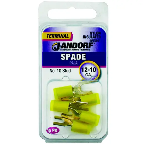 Jandorf Spade Terminal, 600 V, 12 to 10 AWG Wire, Nylon Insulation, Copper Contact, Tin Contact Coating, #10 Stud, Yellow