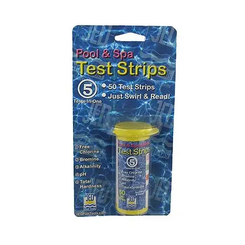 For pools and spas. Each strip tests for free chlorine, bromine, pH, total alkalinity and hardness. Contains 50 strips.