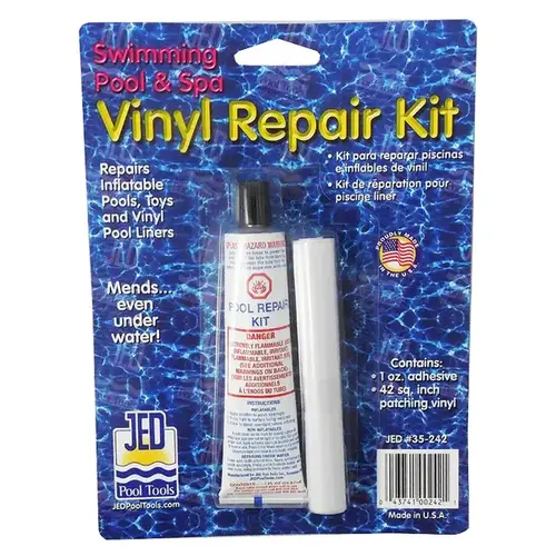 Pool and spa vinyl repair kit. Repairs inflatable pools, toys and vinyl liners. Mends even under water. Kit contains 1 oz of adhesive and 42 sq-in of patching vinyl.