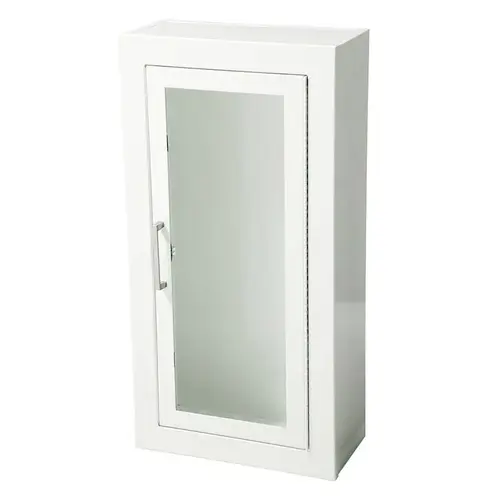 • Door and Trim Construction: Cold rolled steel with white powder-coat finish standard. Flush cabinet doors with a 5/8" door stop are attached by a continuous hinge and equipped with zinc-plated handle and roller catch.