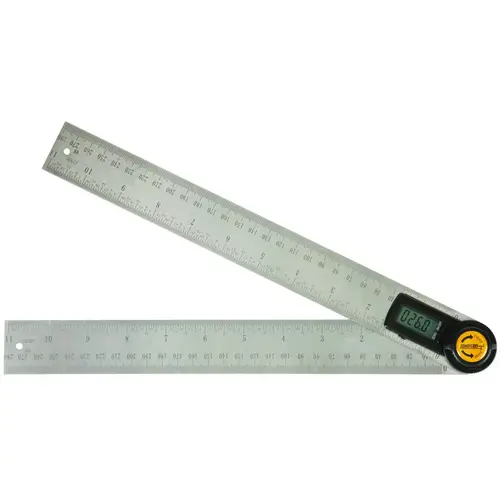 Check and transfer angle measurements and have a ready straight edge all in one tool. This 11 in digital angle locator and ruler is made of durable stainless steel. The digital angle locator displays measurements digitally in degrees on an easy-to-read LCD display. It also features easy two-button operation, including a zero function that lets you set any angle as your zero point. The 11 in ruler portion of this tool includes a scale in 1/32's of an inch and in millimeters. And the lock function allows you to easily lock the blades at any angle, which is useful when transferring angles.