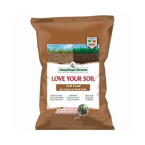 Jonathan Greens Love Your Soil assists in breaking up clay and loosens compacted soils, which improves root penetration, grass growth and root mass. Because hard and compacted soil is often the problem when it comes to growing a great lawn, this product is designed to help release nutrients trapped in the soil for premium grass growth. Love Your Soil also helps to stimulate soil microbial life. The bacteria and fungi in the soil break down organic matter converting it to humus. Healthy biologically active soil contains as much as 5% organic humus while lawns that struggle might contain less than 1%. Feeding a lawn synthetic, chemical fertilizers neglects the microbial life within the soil. In comparison, Love Your Soil feeds and stimulates microbes to build a humus reserve which imparts nutrient-laden water and disease resistance. Microbial populations are responsible for recycling organic waste which makes the soil more porous allowing air, water and grassroots to penetrate deeper.