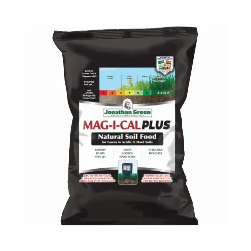 Jonathan Green Mag-I-Cal Plus for lawns in acidic and hard soil contains calcium carbonate in a completely soluble form that is immediately available to adjust soil pH upwards. Poor soil is often the problem in growing a great lawn and calcium is vital to many grass plant functions. When soil is compacted or too acidic, air, water and nutrients are unable to reach the roots, making it very difficult for grass to flourish. Lawns thrive in soil with slightly acidic to neutral pH levels ranging from 6.2 to 7. When pH levels drop between four to six weeds flourish and the grass becomes light green and spindly. Additionally, Mag-I-Cal Plus helps to break up clay and compacted soils. This improves root penetration and promotes growth by increasing biological activity and releasing nutrients trapped in the soil.