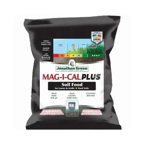 Mag-I-Cal Plus Natural Soil food for lawns in acidic and hard soil is a unique soil food combination product that rapidly raises pH and loosens soil compaction. Feeds and activates soil microbes and maximizes plant absorption of lawn food nutrients. Apply at any time of the year. Promotes air and water penetration for better rooting. Step 3 of the New American Lawn 4-Bag Annual Program. Will not burn lawns.