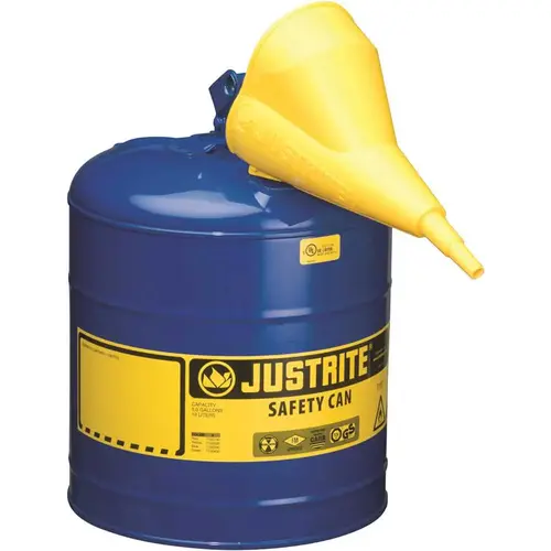 Type I Steel Safety Can for flammables, Funnel 11202Y, 5 gallon, S/S flame arrester, self-close lid, Blue.