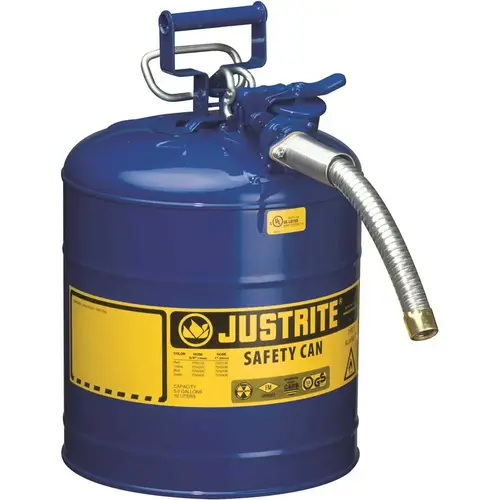 Type II AccuFlow Steel Safety Can for flammables, 5 gal., S/S flame arrester, 1" metal hose, Blue.