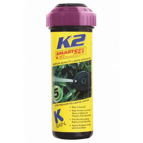 The K2 Smartset Professional 5 in. Pop-Up Gear Drive for Reclaimed Water. Easy to set patented arc adjustment from 40 - 360, with pre-installed 2.5 GPM nozzle. Tamper resistant arc memory clutch, prevents internal gear damage and returns rotor to its prior setting. Distance adjusts with retention screw from 20 ft. - 55 ft. 5-year warranty.