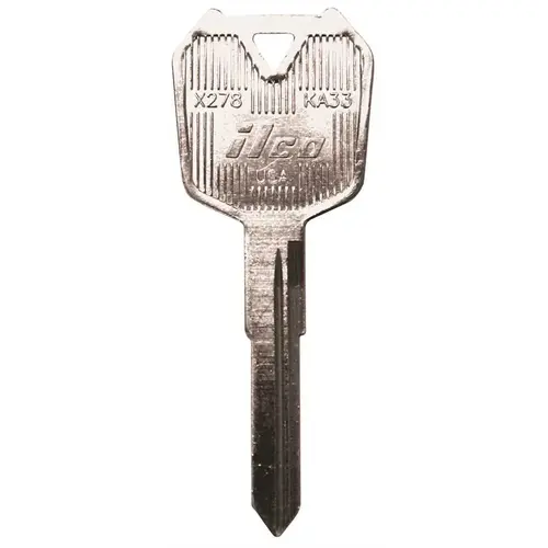 This automotive key blank is manufactured from solid brass. It is nickel plated to assure a long-lasting, durable and bright finish. This is a genuine KABA ILCO product.