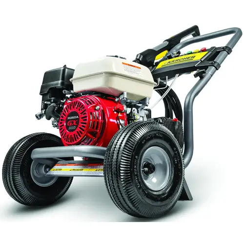 Driven by a powerful Honda GX200 engine, the G 3500 OHT is the ideal work companion for contractors and demanding users. Equipped with a three piston crankshaft (triplex) pump with professional-grade unloader valve, this unit can handle the largest and most challenging cleaning assignments. Pros will appreciate the 25 ft steel-braided rubber high pressure hose, pneumatic tires with metal wheels and durable welded frame.