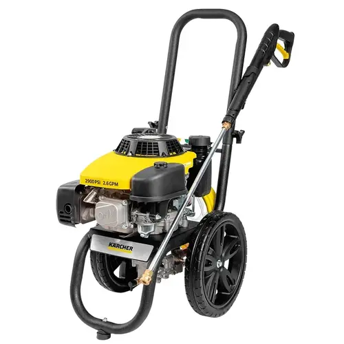 The G 2900 E is our most compact gas powered pressure washer. It generates 2900 psi of TruPressure, ensuring you get consistent cleaning power in a pressure washer that takes up minimal storage space. The G 2900 E portable gas pressure washer delivers 2900 psi of TruPressure, ensuring you get the highest level of cleaning power. It is powered by a performance driven Karcher KPS 196 cc engine with auto choke for easy starting just pull the trigger and clean. Equipped with oversized 12 in wheels, onboard accessory storage, four spray nozzles and easy access hose connections, this pressure washer was designed with the homeowner in mind. Its rugged welded steel frame is easy to transport and requires no tools for assembly. Set up and start cleaning in 5 min or less. Universal quick-connect nozzles and standard M22 hose connections simplify nozzle and accessory use.