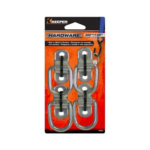 KEEPER's 1-1/2 in D-ring, wire ring with bracket anchor point has a 300 lb working load limit with a 900 lb break strength. Anchor points are a convenient way to attach tie-downs, twine or rope to a pickup truck or utility trailer. Good for light equipment use. Bolt or weld to surface. 4 Pack.