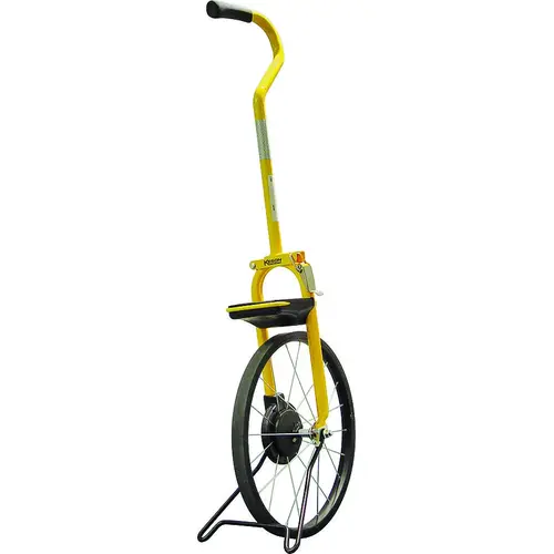 Measuring wheel with a steel frame, swan-neck ergonomic handle grip ensures less wrist strain and better control. Magnetic sensors for dust, dirt and other particles that can disrupt a light beam, magnetic pick-up avoids these problems. Easy-to-read digital counter is in the most protected spot on the wheel. With the handle up, it is nearly impossible for the counter to come into contact with the ground. With the handle down, the roll bar offers solid protection. Counter requires 2 AA batteries (not included). Display backlit 7 digit LCD display for low-light usage, Up to 99,999 ft, 11 in or 99999.9 in tenths and metric. Sealed counter encasement meets NEMA Class II standards, housing will not be damaged by rain, clean the entire wheel with a damp cloth.