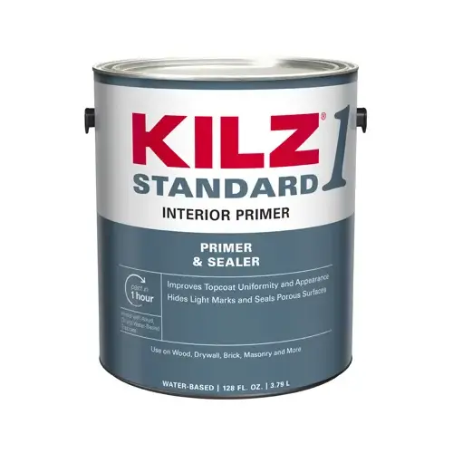 KILZ 1 standard primer is designed for use on multiple interior surfaces helping save cost by reducing the number of coats of paint needed to achieve optimal results. It seals porous surfaces, hides minor scuffs and marks and promotes a more uniform appearance of the topcoat. It's ready to brush, roll or spray and can be top-coated after one hour with latex or oil-based paint. Use Kilz standard primer on almost all interior surfaces including wood, drywall, plaster, brick, masonry and more. Not recommended for flooring, glossy surfaces, mold and mildew prone surfaces or for stain blocking.