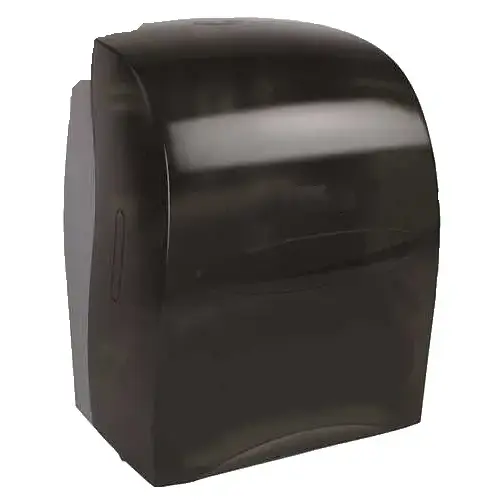 Reduce maintenance time and run-outs with a high-capacity washroom towel system. The Sanitouch Hard Roll Paper Towel Dispenser is a reliable and efficient hand-drying system that's perfect for your workplace. Whether you have a retail location, office or high-traffic location, your washroom guests will only touch the towel they use, thanks to the touch free, one-at-a-time dispensing system. This wall mount dispenser is made of durable plastic and comes in an attractive shade of black, called Smoke, so it will go with any washroom décor. Compatible with Kleenex and Scott Brand Hard Roll towels with a 1.5" core, by providing high-quality towels in your washroom, you'll increase your maintenance efficiency.
