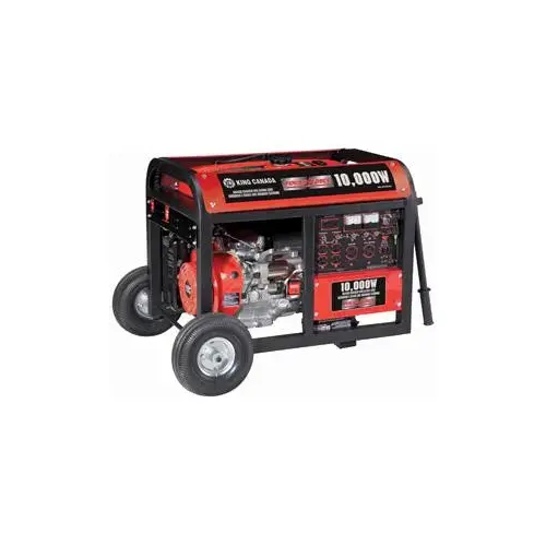 KING CANADA Generator, 12,000 W Starting, 9000 W Output Running, AVR 120/240 V, 75/35.5 A, 4-Stroke OHV Engine, Engine Specifications: 18 hp, 457 cc Displacement, Electric Start, 3750 rpm Speed, Gasoline Fuel, 30 L Tank, 8 to 9 hr Run, 73 dB Sound Level, Dimensions: 36-3/4 in L x 31 in W x 26-1/2 in H, Includes: 10 in Wheels, 12 V Battery, Pivot Handle