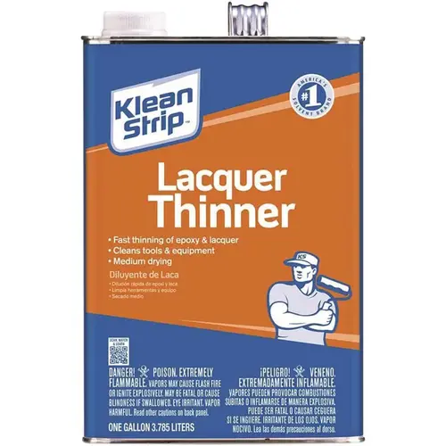 For Pro™s and DIY™ers, Klean-Strip® is the leading brand of solvents, thinners, removers, and cleaners that are dependable for reliable results. Klean-Strip® Lacquer Thinner is a high-solvency, medium-drying thinner for lacquer. Cleans tools and equipment after a lacquer project. Keep out of reach of children. Not for sale in California.