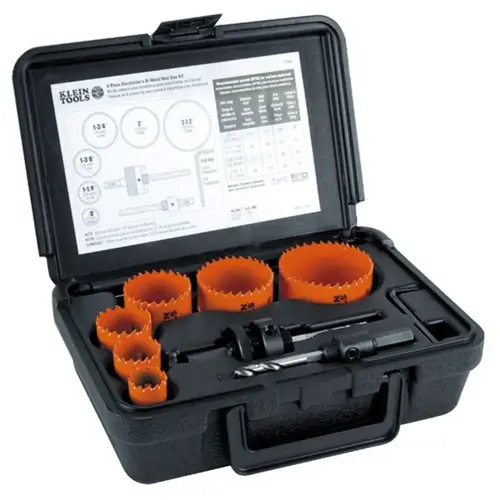 Klein 8-Piece Bi-Metal Hole Saw Kit. Optimized Teeth Pattern For Fast, Consistent Cutting Of Steel Including Stainless. Kit Contains The Most Popular Sizes For Basic Electrical Work: 7/8-Inch, 1-1/8-Inch, 1-3/8-Inch, 1-3/4-Inch, 2-Inch And 2-1/2-Inch (22, 29, 35, 44, 51 And 64 Mm) Saws. Recommended For Most Major Brands Of 6-Inch (152 Mm) Recessed Lighting Fixtures. Bore Through 2x4s In A Single Pass. Multiple Leverage Points For Easy Slug Removal. Includes Two Arbors And A Rugged Carrying Case. Note: Set Pilot Drill Point 1/8-Inch Beyond Tooth Points. Mfg #31902