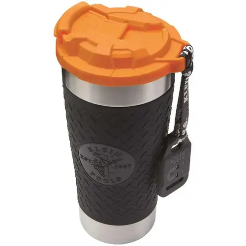 Klein Tools Tradesman Tumbler. Tumbler Uses Double Wall Vacuum Insulated Stainless Steel To Keep Liquid Cold Up To 12 Hours And Hot Up To 4 Hours. Unique double-thread lid design allows easy twisting with gloves on or off. Flip-top lid locks to form a spill-resistant seal for transport. Textured silicone outer sleeve enables a slip-resistant grip with gloved or ungloved hands. Slip-resistant bottom pad friction-grips to most surfaces. Removable Rare-Earth magnetic lanyard helps secure tumbler to metal objects. Made from stainless steel and other BPA-free food grade materials. Mfg #55580