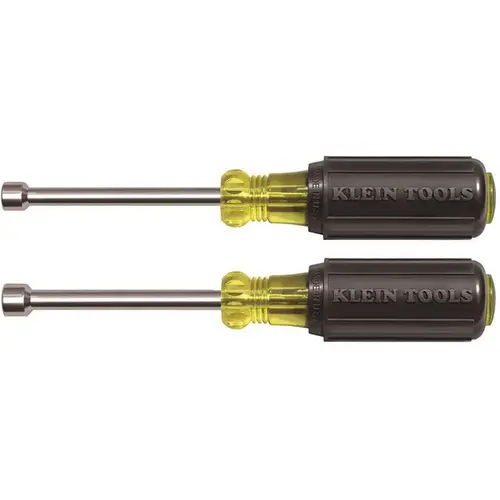 Klein Tools Magnetic Nut Drive Set With Hollow Shaft 3". Hollow Shaft Design With Rare Earth Magnetic Tip Facilitates Work On Bolt Applications. Set Contains: 1/4-Inch (630-1/4m) And 5/16-Inch (630-5/16m) Hex Sizes. Handle End Is Color Coded For Easy Identification. Cushion-Grip Handle Allows For Greater Torque And Comfort. Internal Flanges Provide Solid, Twist-Resistant Shaft Anchor. Made In The Usa. Mfg #630M