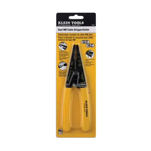 With 12/2 and 14/2 stripping slots to quickly remove outer jacket of type NM-B non-metallic-sheathed cable. Stripping holes remove insulation on 12 AWG and 14 AWG lead wire. Narrow nose fits into tight places. Precision staggered shear-type blades for square, clean cuts on solid copper wire. Curved handles help reach into confined areas. Strong-gripping serrated nose, for easy bending, shaping and pulling of wire. Wire looping and bending holes. Screw-shearing holes. Coil spring provides fast self-opening action. Closure lock for storage. Double-dipped comfort grips. Yellow and white handle. Used for 12 AWG and 14 AWG solid wire.