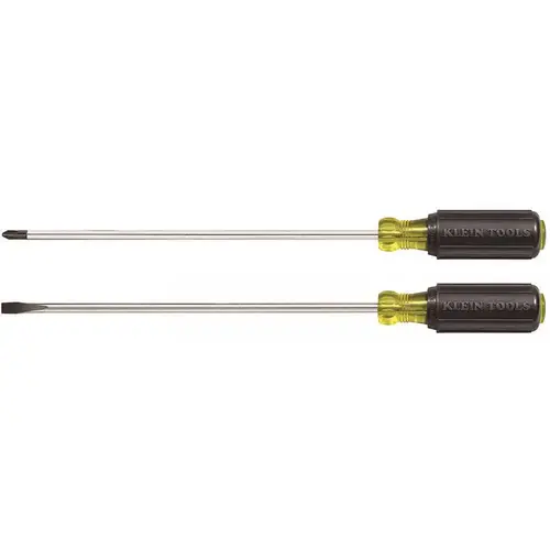 Klein Steel 2-Piece Long Blade Screwdriver Set 10". Ideal For Hard-To-Reach Places Where Length Is Necessary. Includes One Phillips-Tip Screwdriver And One Cabinet-Tip Screwdriver. Phillips-Tip Is Precision-Machined To Provide A More Consistent Geometric Symmetry Than Conventional Phillips Screwdrivers. Precision Ground Narrow Cabinet Tip Permits Blade Access Where Space Is Limited. Cushion-Grip Handle For Greater Torque And Comfort. Premium Chrome-Plated For Smooth Feel And Corrosion Resistance. Internal Flanges Inside Handle Provide Solid, Twist-Resistant Blade Anchor. Special Heat-Treated Shafts. Meets Or Exceeds Applicable Asme / Ansi Specifications. Tip-Ident Quickly Identifies The Screwdriver Type And Tip Orientation. Mfg #85072