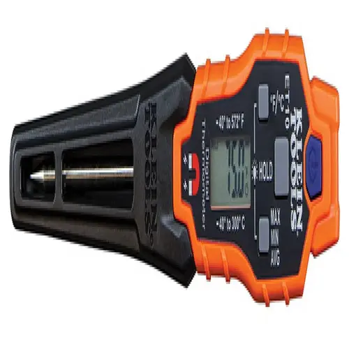 Klein Magnetic Digital Pocket Thermometer is a digital thermometer that takes ambient and direct-contact readings in both Fahrenheit and Celsius scales. The rugged, portable design with magnet makes it a practical choice of HVAC field service teams. Magnet inside base of probe attaches easily to air vents. The protective sheath cleverly serves as a handle to extend reach. Mfg #ET10