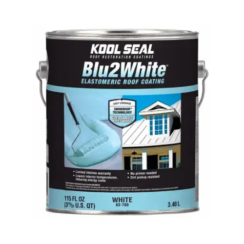 Kool Seal Blu2white elastomeric roof coating is a color changing acrylic finish coat that provides a highly reflective finish to lower interior temperatures and reduce energy costs. This product is formulated with SnowRoof technology for easy coverage Blu2White coating is blue in color during application and will transition to bright white when drying, usually within 24 hr. Transition time will depend on environmental conditions and amount of sunlight. Kool Seal Blu2White coating provides excellent waterproofing capabilities.