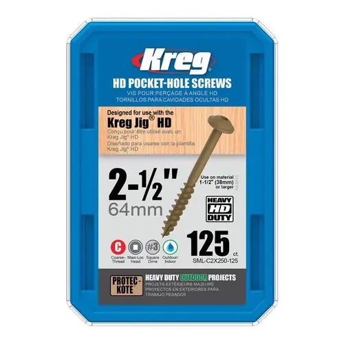 For use with the Kreg Jig HD and 1-1/2 in and larger stock. Large 2-1/2 in long #14 hardened steel screws provide ideal shear resistance as well as a Protec-Kote finish with 3 anti-corrosion layers for long term moisture resistance.