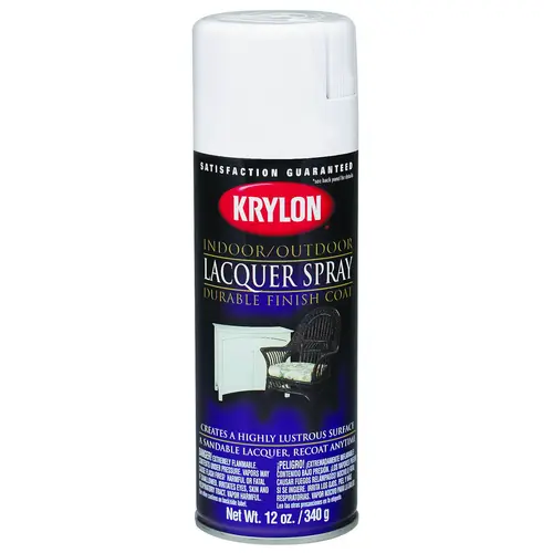 Krylon Lacquer Paint, Net Content: 12 oz, Aerosol Can, Liquid, Clear, Sheen: Gloss, Compositions: Acetone, n-Butyl Acetate, Propane, Butane, Ethyl 3-Ethoxypropionate, Xylene, Mixed Isomers, Ethylbenzene, Specific Gravity: 0.74, Flash Point: -20.2 deg F, Flammability Rating: 4, pH Range: 7, 15 to 20 sq-ft Coverage Area, Drying Time: 1 hr Handle, 15 min Touch, Base Type: Acrylic, Resists: Fade, Moisture, Water, Temperature Rating: 55 to 75 deg F, Application Method: Spray, Applicable Materials: Ceramic, Glass, Metal, Plaster, Wicker, Wood, Thinners: Lacquer, Interior/Exterior: Exterior, Interior