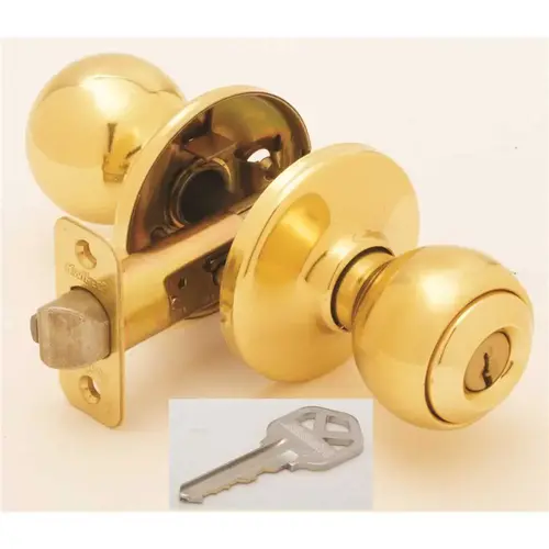Kwikset Storeroom Keyed Entry Knob, Design: Polo, Security Grade: 3, Knob Handle, Backset Type: Adjustable, Backset Size: 2-3/8 to 2-3/4 in, Edge Bore Diameter: 1 in, Cross Bore Diameter: 2-1/8 in, Door Thickness: 1-3/8 to 1-3/4 in, Faceplate Size: 1 x 2-1/4 in, Bolt Throw Size: 1/2 in, Door Handing: Reversible, Polished Brass, Projection Size: 2-3/4 in, Dimensions: 1-7/8 in Dia
