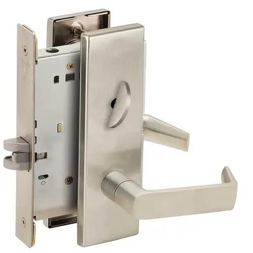 Grade 1 Bed Bathroom Privacy Mortise Lock, 06 Lever, N Escutcheon, Satin Nickel Plated Clear Coated Finish, Field Reversible