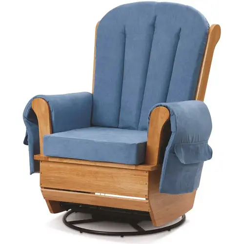 Heavy Duty Glider Rocker with hardwood construction on tip-resistant metal base that swivels 360 degree for easy room viewing. Wide seating surface with high density foam cushions provide comfort for the user. Side panels with storage pockets. Seat cover and side panels in dark blue fabric can be removed for cleaning. Fully enclosed base keeps babies and toddlers away from Swivel/ Gliding mechanism. Meets California 117-fire standards.