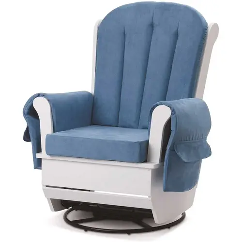 Heavy Duty Glider Rocker with hardwood construction on tip-resistant metal base that swivels 360 degree for easy room viewing. Wide seating surface with high density foam cushions provide comfort for the user. Side panels with storage pockets. Seat cover and side panels in dark blue fabric can be removed for cleaning. Fully enclosed base keeps babies and toddlers away from Swivel/ Gliding mechanism. Meets California 117-fire standards.