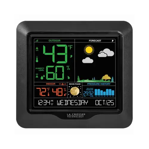 Weather in color, right at your fingertips. Vibrant LCD with light adjustable backlight for nighttime use with On-Demand option by battery power or continuous lighting using included AC adapter. Displays indoor and outdoor temperature and humidity with a 12 hour forecast based upon barometric pressure. Atomic time and date. Updates for Daylight Saving Time. Calendar displaying: month, day and date. Has a wireless transmission range (up to 300 ft), and outdoor temperature range (-40F - 140F), and customizable alerts for indoor/outdoor temperature and humidity. Includes weather resistant wireless transmitting outdoor sensor. Batteries Not Included.
