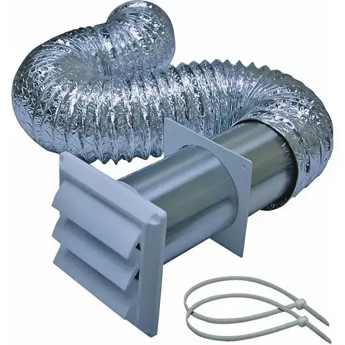 Includes: (1) 4 in White Plastic Louvered Vent with 11 in Tail Pipe (1) 4 in White Plastic Trim Plate (1) 4 in x 8 ft UL 2158A Laminated Transition Duct (2) 4 in Galvanized Tension Clamps