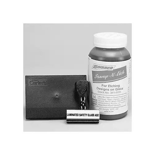 The CRL Laminated Glass Etching Kit includes: Stamp " Laminated Safety Glass AS 2", Ink Pad and a 16 OZ. Etching Kit. It has a variety of general uses but especially popular on laminated glass.