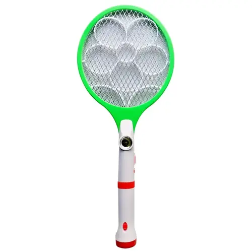 The electric mosquito swatter with LED light and torch includes a rechargeable battery. The AC 110-220 V 60 Hz swatter can be recharged 600 times.