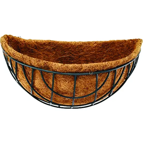 Wall mount, half circle steel basket with a natural coconut fiber liner. Dimension of 14 in W x 6-1/2 in H x 6-1/2 in Dia.