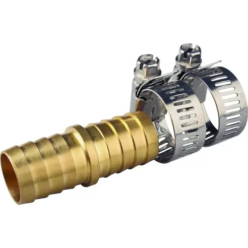 Brass hose coupling with stainless steel hose clamp.