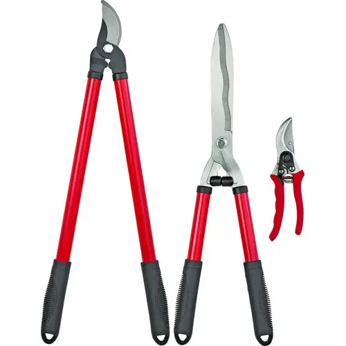 Durable pruner set for trimming plants, shrubs and small trees. Cushioned grip handles for maneuverability and ease of use.