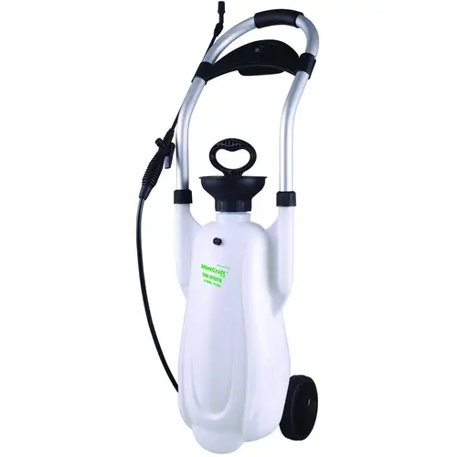 Rolling pressure sprayer with 2 wheels. General-purpose pressure sprayer ideal for spraying water, fertilizers, herbicides, pesticides and much more. Sprayer wand with adjustable sprayer nozzle and On/Off trigger lock. Pump and sprayer constructed of non-corrosive polyethylene, heavy-duty hose.