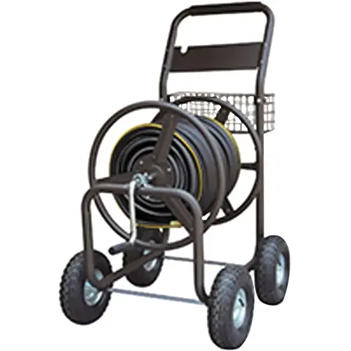 The Landscapers Select hose reel cart is made from a durable powder coated steel construction. It has a convenient top storage basket, 6 ft leader hose, and 10 in pneumatic wheels with steel rim, which is included.