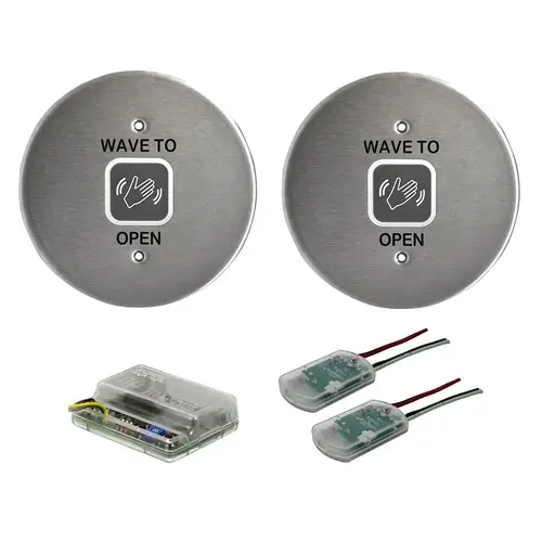 Heavy Duty Touchless Actuator Kit, Round, Text & Wave Icon, Includes (2) 8310-810R Actuators, (1) 8310-880 Receiver and (2) 8310-885 Transmitters, Satin Stainless Steel Finish