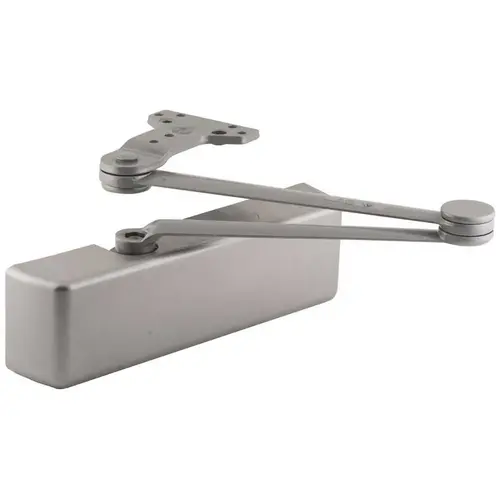 The LCN 4040 door closer has a double lever, forged steel arm, has an aluminum powder coated finish, and is for use in heavy duty applications on interior or exterior doors. The hydraulic cylinder is made of cast iron, has a forged steel piston and double heat treated steel pinion for resistance to wear. Features wide bearings for increased load capacity, and is certified for 10 million cycles.