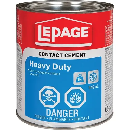 LePage heavy-duty contact cement is a premium-grade, solvent-based adhesive that offers a high-strength bond resistant to heat, creep, water and oil. It dries quickly and bonds on contact thus eliminating clamping. LePage heavy-duty contact cement has 1.5X better coverage and strength than multi-purpose contact cements.