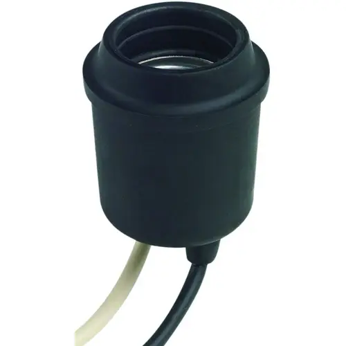 Incandescent lamp holder, medium base, single circuit, 660 W - 250 V, black rubber, with shoulder for clamp type shade, with two 6 in 16 AWG black and white leads, free ends stripped 3/4 in.