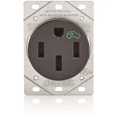 Leviton 50 Amp EV Charging Receptacle/Outlet, Heavy Duty Pressure-Wire Terminal Connections Ensures Full-Contact With The Conductors Features heavy-gauge, high-performance copper contacts Mfg #R10-1450R-0B0