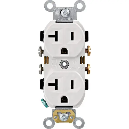 2-pole, 3-wire duplex receptacle. Features combination back and side wired design. Commercial spec grade device is designed to withstand the most demanding environments. Includes heavy-duty brass power contacts for maximum conductivity. Features a heavy-gauge, rust-resistant steel mounting strap.